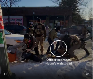 Another agent, standing beside the agent in the gray jacket, unholsters his gun at virtually the same moment and points it at Pretti’s back at close range. At least two agents are attempting to hold him down. A split second later comes the crack of the first gunshot, though the videos do not clearly show which agent fired. Pretti gets up on one knee and falls over as the agent who had unholstered his weapon fires in rapid succession.