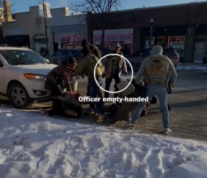 As at least four agents attempt to subdue Pretti, an officer wearing a gray jacket approaches. His gloved hands are empty, video shows.