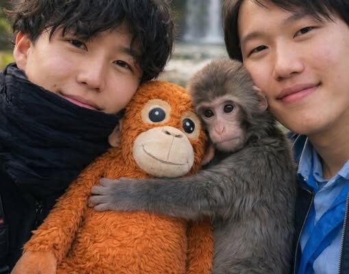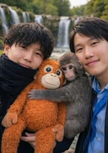 Both individuals are smiling softly at the camera. One of them is holding a bright orange stuffed monkey toy, which adds a playful and cheerful touch to the photo. A small monkey is also present, hugging the stuffed toy closely, almost as if it’s cuddling it. The monkey looks relaxed and comfortable, creating a charming and heartwarming moment.