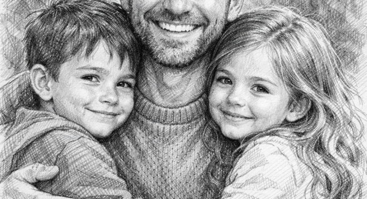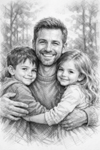 “A high-quality, realistic pencil sketch of a father smiling warmly while hugging his young son and daughter. The father is in the center, wearing a textured sweater, with the children nestled closely on either side of him. The style should feature fine graphite cross-hatching, soft shading, and visible pencil strokes on a white paper texture. The background is a softly blurred outdoor forest scene, creating a gentle bokeh effect. The lighting is bright and natural, highlighting the detailed expressions and hair textures of the trio.”