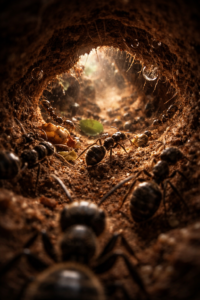 The color palette is dominated by rich, earthy browns, blacks, and deep shadows, punctuated by the brilliant white and yellow light at the tunnel exit. The overall atmosphere is intimate, intense, and macro-focused, emphasizing the large scale of the small world of the ants.