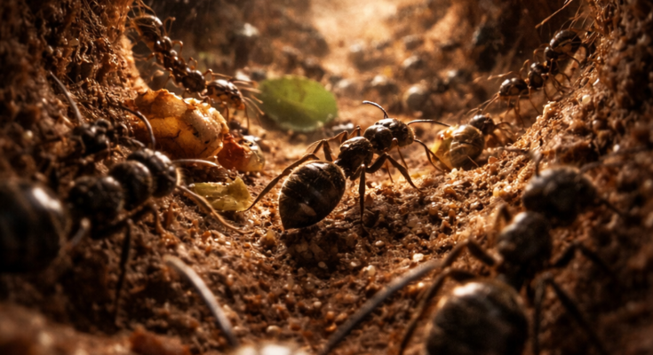 Numerous other smaller ants are scattered throughout the tunnel floor, some moving towards the light and others clustered around bits of debris. The debris includes yellowish-brown detritus and a small, green leaf fragment near the center of the tunnel.