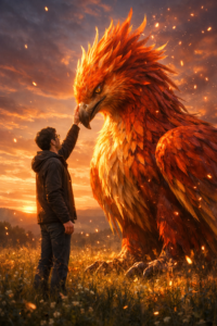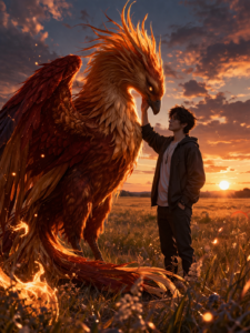 A young man in glasses stands in a wide meadow at sunset. A giant phoenix with golden red fur is beside it standing gracefully, Small sparks of fire flickering in the air without burning anything.