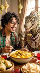 At the center of the image is the most unexpected subject—a humanoid raptor dinosaur. Its presence is both startling and fascinating, rendered with an extraordinary level of realism. The texture of its skin is detailed, with fine scales visible across its face and neck, catching the warm ambient light. Its eyes are vivid and expressive, with a bright golden-yellow iris that seems almost luminous. The raptor’s mouth is slightly open, revealing sharp teeth, yet its expression is not threatening. Instead, it appears joyful and engaged, fully immersed in the act of eating. The creature is dressed in what appears to be traditional Eid attire—a light-colored, intricately embroidered shirt paired with a small cap. The clothing fits naturally, blending the fantastical creature seamlessly into a human cultural setting.