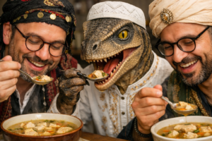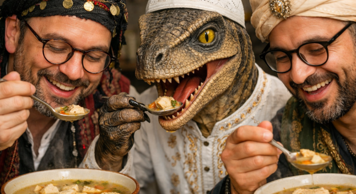 Texture is another standout feature. From the smooth ceramic bowls to the rough, scaly skin of the raptor, and the soft, layered fabrics of the clothing, every element is rendered with precision. The viewer can almost feel the different surfaces—the warmth of the soup, the softness of the garments, and the tactile quality of the raptor’s skin. This attention to detail contributes to the realism of the image, making the fantastical elements feel believable.